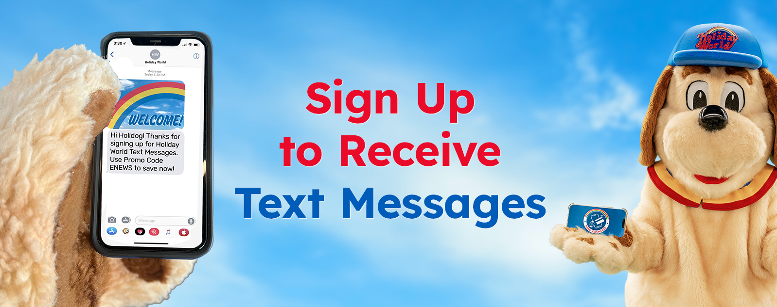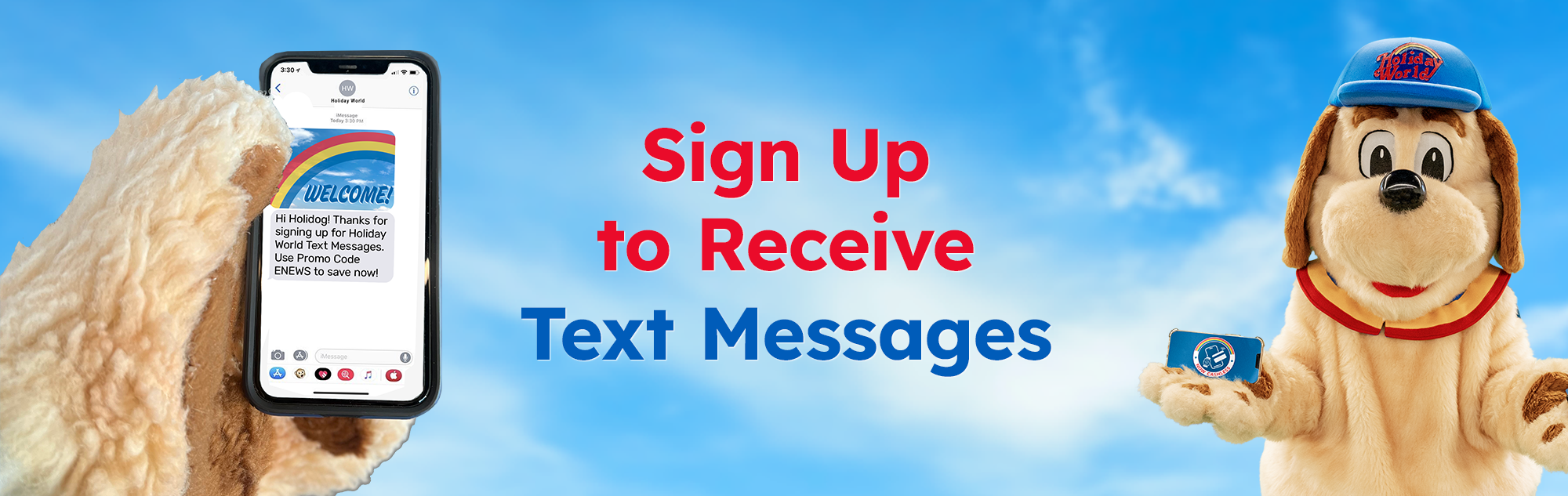 To receive periodic text updates from Holiday World & Splashin’ Safari, enter your phone number, name, and email address in the form below. Keep reading below the form for more information on tailored messaging on specific topics!