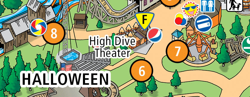 Burgers, Chicken Tenders, Garlic Cheese Curds. Located in Halloween next to The Legend.